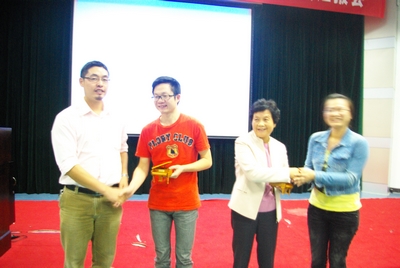 “三叶草”队员们配合手语表演《感恩的心》 向李惠利医院李医生和学院心理咨询中心滕老师赠送礼品