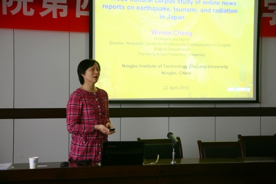 Winnie Cheng教授在题为Radiation soars in sea off nuclear crisis plant: A cross-cultural corpus study of online news reports on earthquake, tsunami, and radiation in Japan的第一场报告中,介绍利用ConcGram1.0软件,以语料库语言学和批评话语分析作为理论框架,从高频词汇,词汇搭配等八个方面比较了五家主流媒体BBC、CNN、SCMP、 China Daily English和Yomiuri Shimbun对于日本地震、海啸和辐射的新闻报道,分析它们的共同点和不同之处,揭示其背后隐藏的文化意识形态的差异和各新闻机构立场、观念的差异。