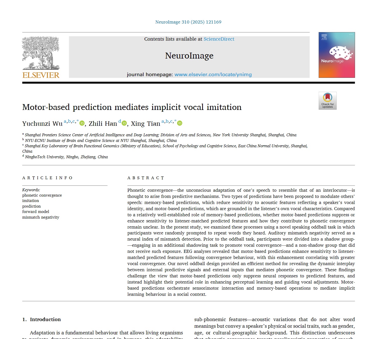 韩志力博士在著名期刊《NeuroImage》发表的论文Motor-based prediction mediates implicit vocal imitation